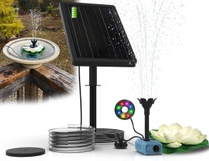 This Solar Fountain Pump for Bird Bath combines a built-in battery backup with LED lights to provide water movement and illumination after sunset. It features multiple spray nozzles and automatic operation when sunlight is sufficient.